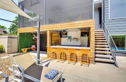While seated near the fire pit you can see your swimmers in the pool through the side window which is constructed from a shipping container. Plenty of lounging on the pool deck which is adjacent to the bar that has seating, a tv and a refrigerator.