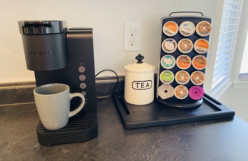 Continue into the kitchen area where you’ll find additional seating for 4 as well as a bar stand with plenty of wine glasses and accessories to enjoy both your favorite red or white. The kitchen features stainless steel appliances and comes fully equipped with everything you'd expect to find in your own home. Make yourself a cup of coffee using either the Keurig, one of two different sizes of coffee pots or the pour over.