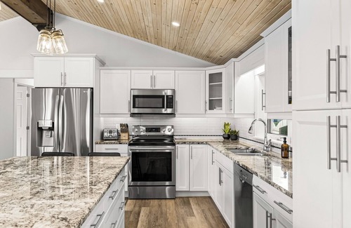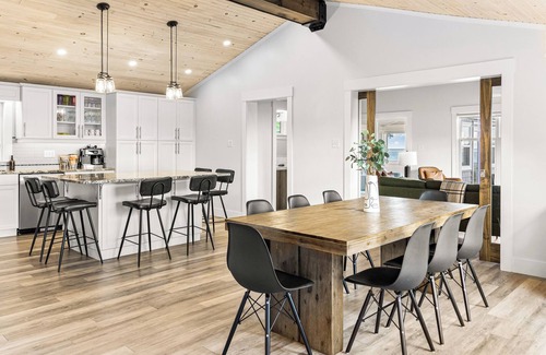Inside, the cottage features 2 cozy bedrooms, including one bedroom with a king bed, one bedroom with 2 bunk beds, and 1 queen size murphy bed in the living room, ensuring a restful stay for everyone. With 1.5 bathrooms, convenience and privacy are well-preserved.