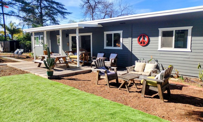 Please message me any requests no matter what it is. Imagine relaxing between the mountains and the seas perched near to the trees on a large private country Ojai property. Casa Calma boasts 3 bedrooms 3 baths all en suite w queen beds. Extremely private gated, fenced compound oasis, Topa Topa views w an indoor-outdoor vibe and an open floor plan perfect for entertaining Infants, Kids, and Seniors. Newly staged throughout and super clean. Fully fenced property pet friendly w solar, fruit trees, pine grove, home office, laundry machines, Bbq, 2 terraces, and 2 private patios, fenced park like yard, beaches nearby, and close hiking at the Ventura river preserve. Gorgeous new hard surfaces throughout the entire house stays cool and clean. A very special open floor plan w lots of windows and sliders and patios to bring nature into the house and creates a fun environment for any occasion. Come enjoy this Eco friendly solar electric house w style, organic gardens, orchard and drought tolerant botanical experience. If you want hip clean modern digs in Ojai, look no further. I recently updated all of the furnishings. Board games and kitchen w oils, condiments, dishes, pots and pans, and coffee maker etc. Plenty of giant spruce trees nice and shady. The lot is sunny with mountain views and also has shade from the trees w a cool breeze comes up from the ocean. You and your friends or family will have a blast here. Rooms have blackout window treatments allowing for maximum sleeping comfort. Lots of vintage touches throughout the property. All rooms have their own mini splits AC and heating so each guest can adjust to their comfort. Master has a couch and ensuite custom bath w soaking tub for 2. There are 2 couches in the living room. Please respect the property so it is nice for future guests. Great picnic tables and custom made patio furniture. Terraces and patios circle the house with vintage and new furnishings 60 inch and a 42 inch TV.. The hot tub is a 2 person custom tub located in the master bathroom as seen in the photos. No chlorine fresh water every time. I also have Sauna that needs an appointment to use. I can set up bike rentals, massage therapists, yoga therapists, and or private chef. Trolly pics up on the corner ever 45 minutes. Great for wine tasting or choosing not to drive after drinking. Just hop on the trolley and it will bring you home. Let me know if you need any recommendations for restaurants etc. If you like midcentury modern homes then you will love this well appointed furnished designer home. Close to Ventura, Montecito, and Santa Barbara.