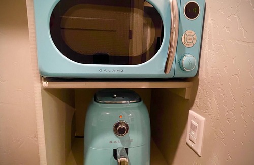 The room is equipped with a convection oven, microwave, air fryer, Keurig coffee maker and refrigerator. This kitchenette is fully stocked with dishes, silverware, cups and utensils to make easy convenient meals along with coffee pods, creamer and other miscellaneous items. The room is stocked with linens, soaps, hair dryer, iron and ironing board to give you all the comforts of home.
