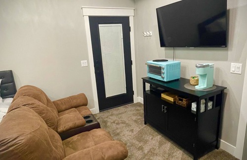 Relax in this beautiful modern studio equipped with a memory foam Queen bed, 2-seater reclining couch and smart TV. This space is a private room with a private entrance; however, it is attached to our home. We are a working family with 3 kids, which means there may be occasional noise, but we always try to be courteous and attentive to this when we have guests.