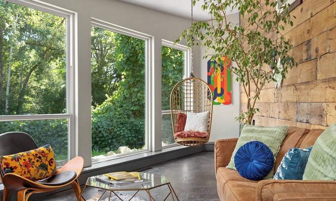 Our spacious 4-bedroom home is a mid-century modern oasis bathed in beautiful natural light. With a sprawling sunroom, this is a serene escape for plant lovers and design enthusiasts alike.
