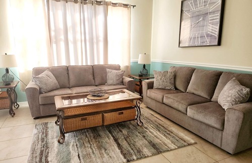 Luxurious, Modern 4 bedroom, 3 bathroom home with high vaulted ceilings. The modern décor and color scheme creates and open, airy feel and is all tiled! No carpet in the home at all. This home has a great layout that allows one family privacy or 2 families or friends the ability to vacation together. There are 2 Master Suites at opposite ends of the house, as well as 2 living rooms with 42” flat screen tv's. There are 2 twin rooms located in the middle of the house. Air conditioning and ceiling fans in all bedrooms.