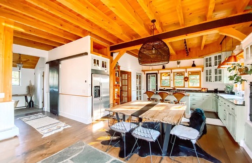 The Eddy has all the modern amenities with a cozy, cabin vibe. Large, three-story, sun soaked living room with views of the mountains to kick back and relax – open concept living that is open to the kitchen. Close to year round outdoors activities –hiking, biking, skiing, waterfalls, swimming holes, mountain biking, etc. Classic wood burning fireplace in the living room with comfortable seating to enjoy a cocktail at night. High-speed wifi and three dedicated workspaces available, with an extra desk stored in the loft if extra is needed. Newer furnishings and artwork from local shops and brands like CB2 and Pottery Barn. Smart TV (no cable), Nest thermostats, heated bathroom floors, and Sonos speakers on every floor. Gas fireplace in the kitchen area, with island seating and an 8-person square table that was custom built by us from Vermont maple. Smeg toaster, wine fridge, stainless steel appliances, all the amenities you need to make a great meal. Great place for gathering with family and friends!