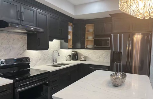 Welcome to our modern private basement suite with a private entrance! Featuring 3 bedrooms (1 king, 2 queen, 1 twin), 1.5 baths, and sleek marble floors. Enjoy a fully equipped kitchen with amenities like a kettle, air fryer, and stainless steel cutlery etc. Relax in the spacious living area with a fireplace and a 58-inch TV. Laundry facilities and fast Wi-Fi are provided. Ample natural light streams in through many windows. There's an office space and a sofa bed accommodating two more guests.