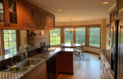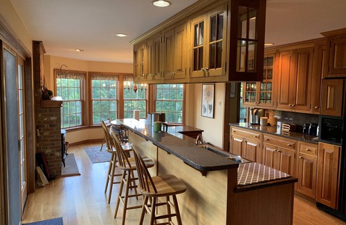 - Gourmet Kitchen: The fully stocked country kitchen, complete with granite countertops and a breakfast bar, is ideal for hosting rehearsal dinners or preparing meals for your bridal party while enjoying stunning views through bay windows.