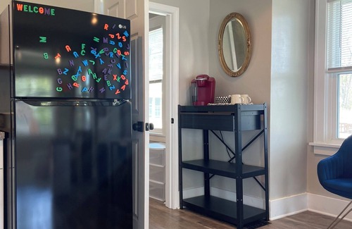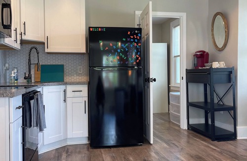 This kitchen is the perfect size, stocked with kitchen supplies you'll need to to cook a meal at home. Help yourself to the mini coffee bar in the dining area.