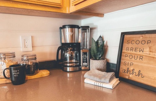 Just down the hall from the entry and to the left is a convenient laundry closet offering a full size washer and dryer. Across the hall is a lounge/viewing room offering a day bed to relax and watch the large flatscreen smart TV. The TV is equipped with Netflix, Disney+, Prime Video as well as cable channels. Once connected to Wifi, you can also watch your favorites by screen mirroring to stream from your personal device. There is a Queen blow up mattress located in the viewing room that can be set up in the upstairs living area. At the end of the hall and completing the downstairs area is a full bath with tub and seat warming toilet.