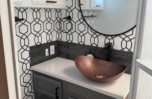 Escape to this exclusive haven where nature meets luxury! Nestled on a tranquil, activity-packed(optional) property, our fully renovated RV offers an unforgettable getaway! Step inside to discover high-end finishes, including quartz countertops, elegant copper sinks, a plush leather sofa, and a spa inspired bathroom complete with a bidet. Sink into the memory foam bed for restful nights and enjoy movie nights on your private, oversized 4K TV.