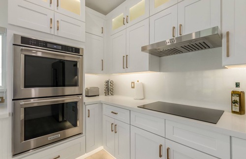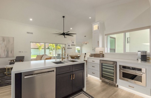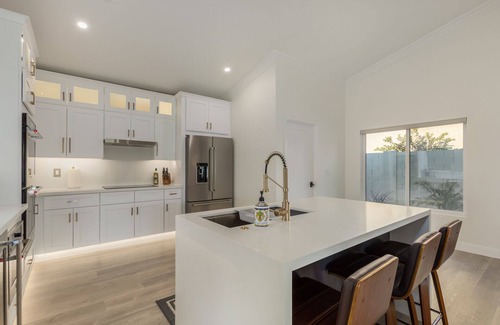 Enjoy a peaceful stay in this sleek yet cozy modern home, completely redone! Primary suite & 2nd bedroom have ensuite baths & 65” TVs. 3rd bedroom w/ a full+twin bunk bed. Covered patio & generous backyard for entertaining & relaxing by the pool! Kitchen is fully equipped w/ double ovens & a wine cooler. Soaring ceilings & open living space w/ a fireplace & 75" TV. Home is set up w/ fiber internet & a desk. Ideal location, easy drive to downtown, close to amenities incl. TopGolf & the aquarium.