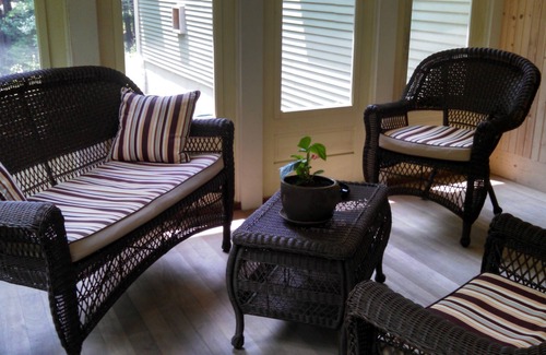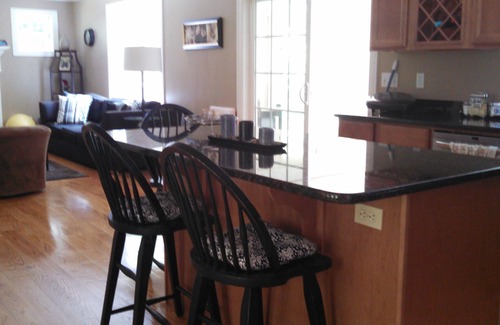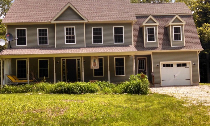 This 2500 square foot home has an open floor plan downstairs with living-room kitchen and screen in porch at the back of the home. A separate sitting room and dining room in the front of the house. The downstairs also has a 1/2 bathroom with laundry. There are two entrances...One the front door or a separate entrance into a mudroom. The front porch is massive with areas to relax. The upstairs has 3 bedrooms ....The master bedroom is quite large with a separate sitting area furnished with loveseat, futon and TV. The master bedroom bathroom is furnished with a deep relaxing tub and separate shower. The 2 additional bedrooms have a great sunny feel with queen beds. The second bathroom has a shower tub combo and would be used by the two additional bedrooms...The kitchen is totally modern with granite counter tops, stainless steel appliances and center island with 3 bar stools to enjoy socializing ...The dining room is furnished with table and 6 chairs for a more intimate dining experience....The best feature of this home is the outdoor screened in room surround by woods and fully furnished with wicker furniture for relaxation in a bug free environment. Downstairs in the basement is a great spot that has ping pong table, air hockey and weight machine to entertain guest. This house is such a wonderful home for couples or families to have quality time together