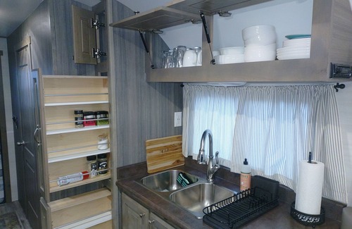 Enjoy what this 1-bedroom modern range camp has to offer. Forced air gas heat, Indoor and outdoor kitchen, Two Queen beds, 3/4 bath. Clothes closet and drawers Pantry, Gas range and oven. convection oven and micro wave, Keurig coffee maker. Refrigerator/ freezer, Solo fire pit with Adirondak chairs, hard woods for cooking and softwoods for just gereral hanging around the camp fire, Treager smoker grill and a weber propane grill.