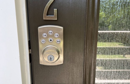 Your private front entrance into unit #2 is the brown/glass door on the right side of the home. The 10' ceilings make the retreat feel incredibly spacious. It includes a coffee maker, a fridge/freezer, a microwave, a ceiling fan, and linens. The custom-tiled bathroom has a solid-surface double vanity and a large glass-enclosed tile shower.