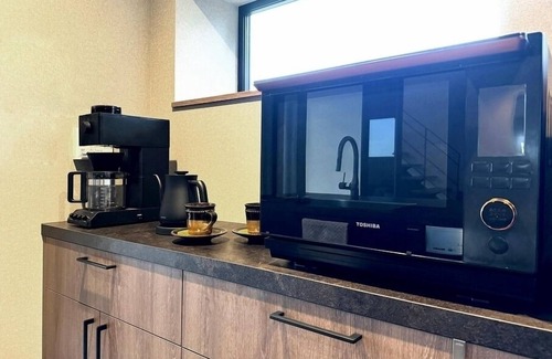 Central heating throughout; Air conditioners throughout (these can also provide heat during winter); Built-in electric heat induction cooktop; Refrigerator; Microwave oven; Rice cooker; Electric kettle; Dishwasher; Coffee maker; Grill toaster; OLED TV, Washer/dryer; Hair dryer; Cordless vacuum cleaner; Bluetooth speaker; Full set of tableware & eating utensils; Full set of cookware & cooking utensils; Heated towel rail; Bath towels; Bath mats; Hand towels; Shampoo/Conditioner/Body soap; Toothbrushes; Smoke detectors; Fire extinguishers; First aid kit; Outdoor security cameras; Free high-speed Internet.