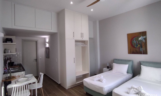 Your Galissas adventure begins at this modern newly built studio. Nestled in a serene setting, this tranquil retreat offers a nice escape for guests. With 1 twin bed in the bedroom, it's perfect for solo travelers or a cozy getaway for two. The property features convenient amenities like Sat-WiFi, a hair dryer, heating, AC, and a washing machine plus access to TV platforms like Netflix and Cinobo. The bathroom is equipped with a hair dryer and a refreshing shower plus amenities you will find nowhere else ( like a set of new toothbrushes and dental cream). Moreover, there is additional space for a third person with the addition of a folding bed or a crib upon demand. Those latter additions are free of charge! Everything is within walking distance from our lodging( e.g. beach 160m).