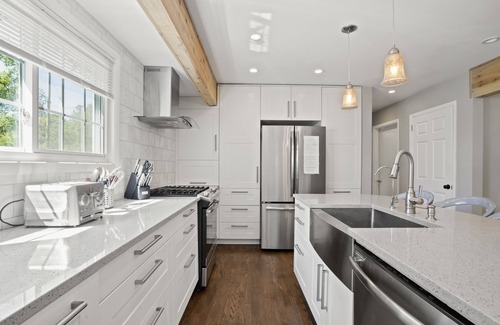 The house is completely furnished with furniture, kitchen supplies, bed linens, and towels. Laundry washer and dryer are provided. Stainless steel appliances, quartz countertops, hardwood floors throughout.
