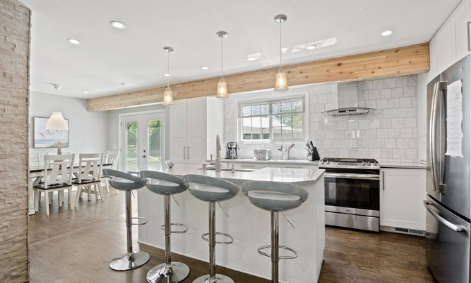 The perfect vacation home for a group. The house is located on a very quiet street set back from the road on a one acre lot with front wooded area, giving guests great privacy. The home was completely renovated in 2018 and fully furnished. The house is in close proximity to the Milwaukee river. Enjoy lounging on the back patio, grilling, or sitting around the fire pit. Located in the heart of Mequon, WI, just a 5 min drive from the highway. Come enjoy a nice quiet stay.