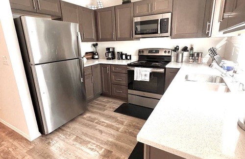Kick back and relax in this beautiful, newly constructed, two bedroom, one bathroom apartment. Tucked in a quiet neighborhood of the Spokane Valley you will find all the amenities of home waiting for you here. With a fully stocked kitchen we have made cooking and eating in a delight. Centrally nestled between downtown Spokane and Coeur D'Alene Idaho there are endless opportunities for outdoor recreation, dining out, site seeing, and enjoying our beautiful gem of a city. Don't feel like going out? Enjoy a night in with our 65" living room TV and 65" master bedroom TV. Whether you are traveling for business or an escape from the daily grind this warm and cozy apartment is a perfect fit. BOOK NOW!