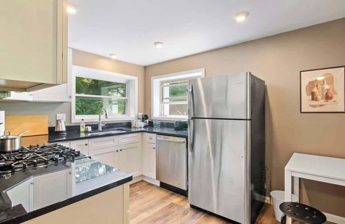 It offers a delightful fusion of modern comforts and inviting warmth with open-concept living area, two generous bedrooms, and a modern bathroom with in unit washer and dryer. Our apartment is equipped with modern amenities: high-speed Wi-Fi, flat-screen TV, and a fully equipped kitchen. Outside, you'll find a quiet backyard where you can eat, play and relax.