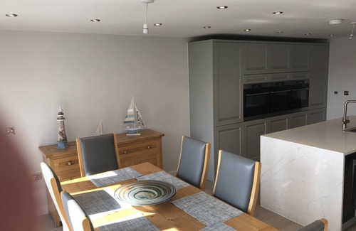 Open plan lounge with stunning sea views, kitchen dinner with dinning table for six with garden views leading to larger decked garden .