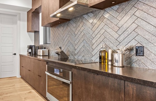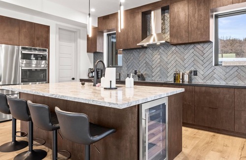 The open-concept living area is the heart of Stonezee, featuring a cozy fireplace and plenty of seating for movie nights or relaxed conversations. The fully equipped kitchen invites culinary creativity with top-of-the-line appliances and ample counter space. Share meals at the handcrafted dining table, which comfortably seats your whole group, and create lasting memories together.