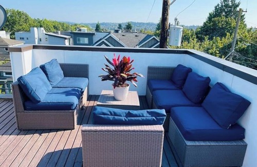 This is a modern three-story corner townhouse with an amazing rooftop deck. Enjoy the sun & sunsets on the tastefully decorated enormous roof deck that runs the entire length and width of the house. See Seattle Skyline & views of the Olympic Mountains & Mount Rainier that will take your breath away. Cook on the brand new grill, eat outside & hang out at the table or on the couches and chairs; leave your favorite drink in the mini-fridge/freezer.