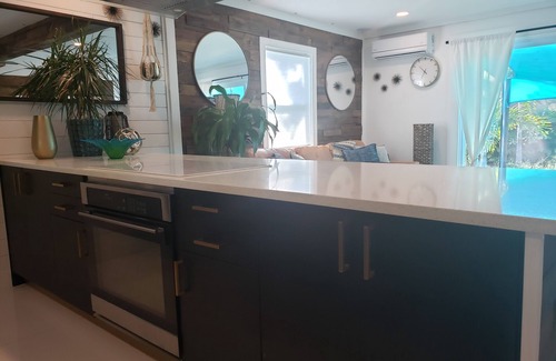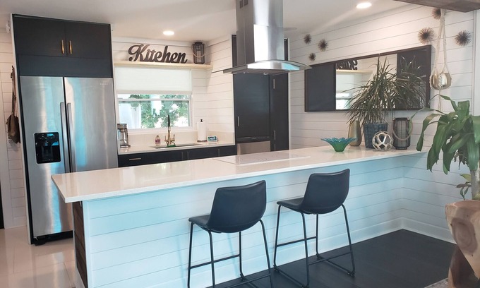 Fully renovated in 2020 everything is brand new! Contemporary furnished cozy home with a private fenced in yard with a covered deck and screened in lounge.. The house includes a queen bed in the master bedroom. The second bedroom can be used for a remote work space and includes a queen sized bed. Each bedroom has its own bathroom with a shower. The bungalow has fully equipped kitchen and full sized washer and dryer. Relax in the backyard with a cup of coffee on the chill lounge outdoor living room set and listen to the birds in this tropical paradise. This bungalow is the perfect vacation getaway.