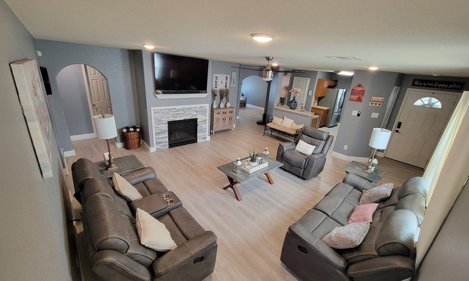 soak up this modern charming new construction home. (23 minutes to downtown Houston) (25 min to bush intercontinental Airport) (7 minutes away from Extreme Offroad Park & Beach! Beautiful white vinyl flooring with modern and stylish furniture always decorated with the seasons to make you feel at home! 65-inch Samsung TV in Living Room W/ Samsung surround sound. New smart updated appliances. Smart TVs. comfortable beds, and a private patio with a 5 burner grill.