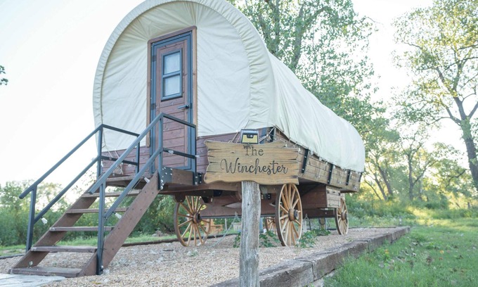 The Winchester Wagon- Embrace the charm of Moon River Ranch in The Winchester Wagon Accommodation, where rustic ambiance meets modern comfort. This spacious wagon boasts two queen beds and two cozy bunk beds, providing ample room for families or groups of friends. The interior seamlessly blends frontier aesthetics with contemporary design, creating a unique and inviting atmosphere!