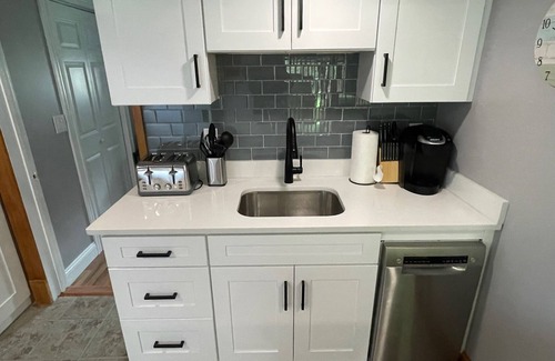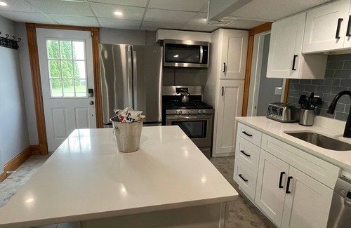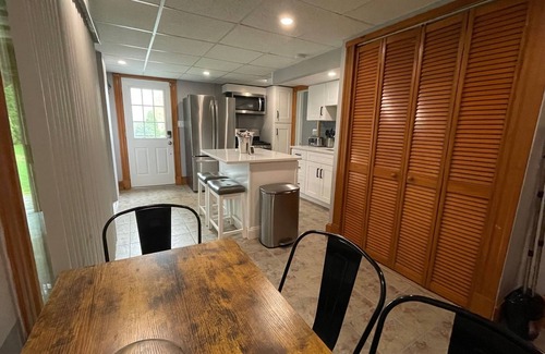 Beautiful newly reconstructed and fully furnished 1 bedroom private apartment attached to a house at the end of a dead end road with friendly neighbors. All new kitchen and appliances, brand new bathroom, on site laundry, hot tub, grill, cabana bar, gas fire pit and more. Quiet neighborhood, large back yard with private woods in the back. Relax and stay for resort-style living!