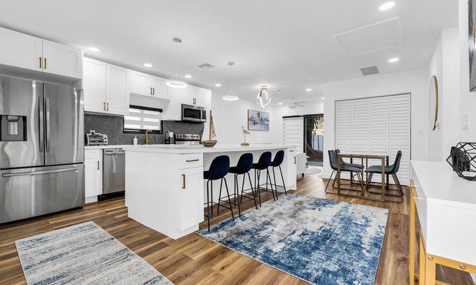 Enjoy a stylish experience at this centrally-located modern home, in Fort Lauderdale! Less then 5 miles from Fort Lauderdale International airport and the beach, there is no better location to enjoy sunny South Florida. This home boasts a sleek modern design, new furniture, appliances, & decor to elevate your stay. Curated furniture & modern lighting creates a contemporary ambiance. The home is located on a quiet family friendly street with great neighbors away from the roadway. The home is also within close proximity to popular South Florida destinations to include downtown Fort Lauderdale, Hard Rock Guitar Hotel and Casino, and Wilton Manors. With a large yard & driveway, your home away from home awaits you in this highly sought after location in the heart of Fort Lauderdale!