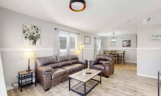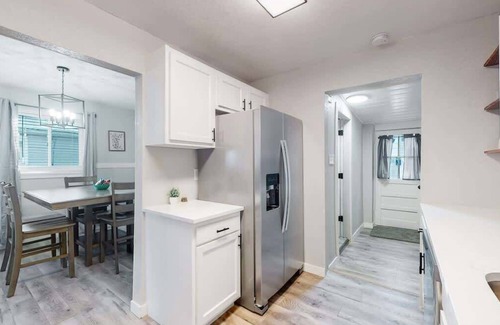 This remodeled ranch home features a bright, open layout with sleek hardwood floors and modern updates. Three cozy bedrooms offer ample space, while the fully equipped kitchen simplifies meal prep. Unwind in the private backyard or enjoy streaming on the smart TV. The in-home washer and dryer add convenience, and the updated bathroom is stocked with essentials. A private entrance with smart lock ensures easy, secure access.