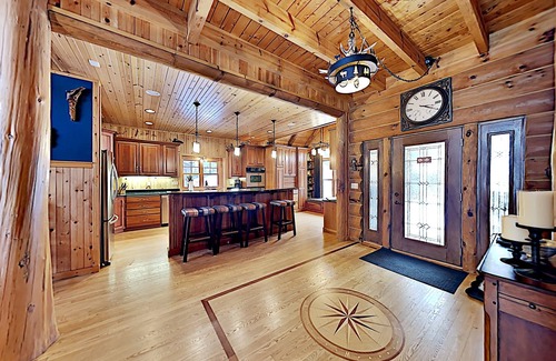 The lower level has another king bedroom with private bath, a TV room and rec room with pool table, gas fireplace. The log bar has a sink, water, beverage refrigerator all leading out to the massive yard that gently slopes down to the water. There are 2 gas fireplaces, one on the main level family room shared with the master BR and one in the lower level game room shared with the rec room. WiFi, satellite Direct TV, gas and charcoal grill, and fully stocked kitchen with pots, pans, plates, and silverware is provided. Parking is permitted in the garage during your stay as well.