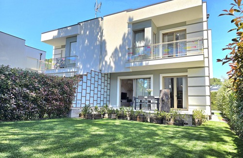 Modern Villa Fully Equipped in Perla Resort at Gjiri i Lalzit Area. Built in two floors with 3 bedrooms, living room, kitchen area, 2 bathrooms and a wonderful garden.Solar panel and Air Conditioning are also installed in the villa. Only 200 meters from the best sandy beach in Albanian Adriatic.Guests can be accommodated at three bedrooms on the upper floor. A bathroom is also in the hallway with a cabin shower. The living room is located on the ground floor with Smart TV Set. Is next to the kitchenette and dinning area. Guests can enjoy the meals inside or at the terrace outside. Another bathroom located in the ground floor as well.We are available for our guest 24/7.Our man on the ground is very helpfull for anything that you may need during your stay.Perla Resort is a gated residential complex at Gjiri i Lalzit area that has been built recently.It is made of villas and apartments. It has 24/7 security.Free parking next to the residence.