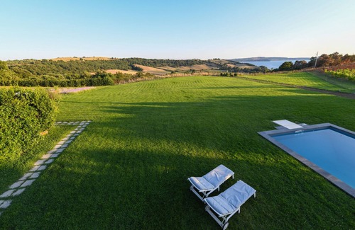 Villa La Quercia is located on the Hill of Silence, a few meters from the Natural Park of Bracciano - Martignano http: // www. parcobracciano. en / 16 / presentation. Html, characterized by Mediterranean vegetation, it offers breathtaking views of the lake of Bracciano, the sunsets are wonderful. Recently constructed it has been designed with natural stone and panoramic windows overlooking the lake; It is located on a hill and it has a private vineyards (Syrah and Vermentino). In its two terraces with chairs and sofas you enjoy the sun and the view. Lunches and dinners will be embraced by nature with its sounds and its fragrances, surrounded by an immense relaxing green area.