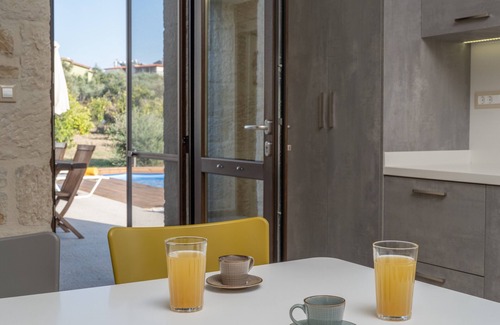 The modern and spacious stone villa, boasting all the contemporary facilities of holiday accommodation, is located in the picturesque village of Galatas, only 15 min. from Chania city and offers the tranquility you need, as well as unique views of the lush countryside and the White Mountains! The 3 spacious bedrooms, hosting 6 guests, the private pool and hot tub, the outdoor dining area with BBQ and the high aesthetic and comfort in all spaces make this villa the top choice for family holidays!