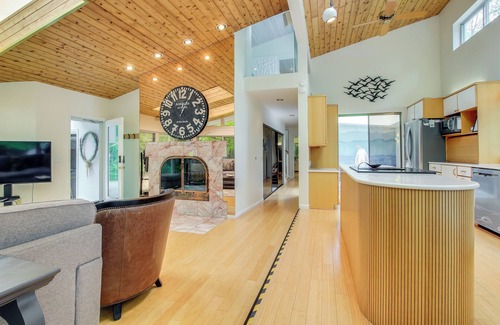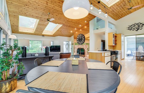 INDOOR LIVING:Smart TV, 2 dining areas, 3 fireplaces (bring your own wood, 2 decorative), vaulted ceilings, skylights, jetted tub, workstation, 2,300 sq ft