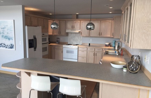 On the main floor, step outside the French doors onto your huge patio with expansive views. You can enjoy the water view while you prepare meals in the fully equipped spacious kitchen. Sit at the breakfast bar and chat with the cook, then dine with a view all together at the large dining table, seating 8 comfortably. Behind the dining table is an extra long built-in bench as well.