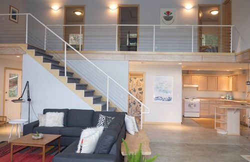 The living room is next to the dining area with floor to ceiling windows has plenty of seating, and a large 48 inch flat screen Smart Roku TV with Netflix subscription. The 20 foot vaulted ceilings make the place feel so large and airy. You'll love the modern, industrial feel of this custom designed house with the high beams, and concrete flooring. There are even ceiling fans to offer a breeze in summer (or just open the doors to outside!).