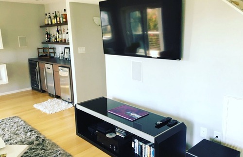 - Separate living area with 65" flatscreen TV, built-in surround speakers, and bar area with ice-maker, wine-cooler and beer refrigerator. We also have a brand new, very comfy pull-out sleeper sofa with queen bed