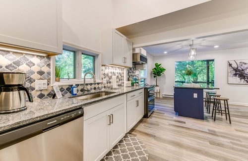 KITCHEN: Dishwasher, stove/oven, refrigerator, microwave, coffee maker, toaster, cooking basics, blender, Crockpot, dishware + flatware, garbage disposal, ice maker, water filter, complimentary spices, trash bags + paper towels, bar seating