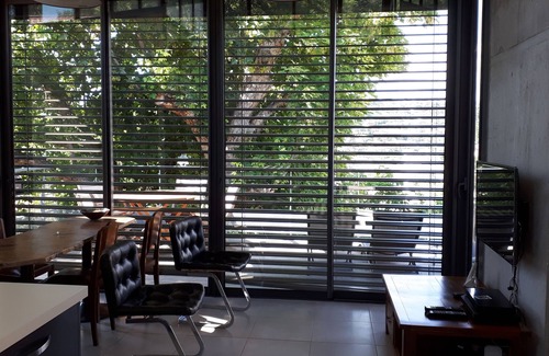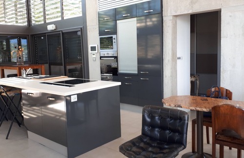 - a living room, open to the outside by large bays over the entire height to the south and north which offer an exceptional panorama. A glass volume of 36 m² around a central island, the bays are covered by motorized sun shades.