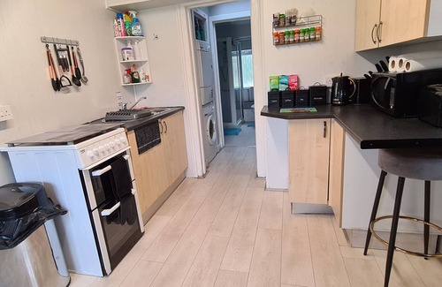 The kitchen has a fridge, a hob, an oven, a toaster, a kettle, a freezer and a microwave basic spices, cooking oil, salt and pepper are supplied also.