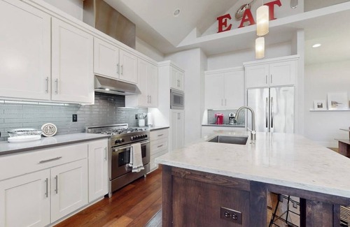 As you enter the townhome, you’ll enter the very open and bright Great Room, featuring rich wood floors, high ceilings, and extra wide glass sliding doors that lead to a deck that offers amazing views of the treetops and the various peaks of the Cascade Mountain Range. Here, you will enjoy a new Weber natural gas grill and seating to enjoy the views. Back inside, the Great Room features a 77 inch LG 4K smart TV as well as a large, modern fireplace for those cool Winter nights. Enjoy the comfort of the modernist style furnishings.