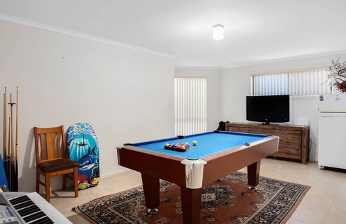Downstairs is a 2nd living area with TV, R/C air conditioner, pool table, CD player and 2nd full size fridge. A further 3 bedrooms, featuring 2 queen beds and a family bunk(double+ single on top). All bedrooms have built-in robes. Full size main bathroom with shower, separate bath and toilet. Laundry facilities include washing machine and dryer. Enclosed backyard. Garage for one car plus off street parking.