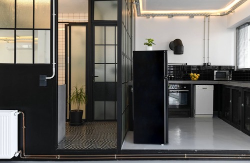 In the living room, there is a super modern separable sofa that you can easily detach its pieces and place them wherever you like in the apart! Enjoy your stay and feel free to live like you can do so in a open space super industrial apartment!