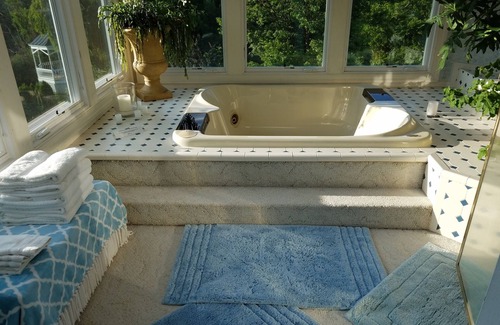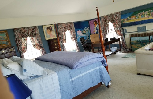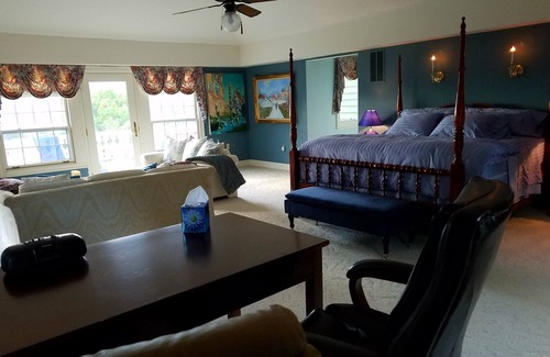 The "Monet Suite" is one of three accommoations we offer in our three unit Bed & Breakfast. This listing depicts our elegantly furnished 2 room spacious master suite, with original Impressionistic oil paintings; private balcony. Magnificent Blue Ridge Mountain views in artist villa located in artist villa on historical Civil War grounds of the Battle of Unison, in the heart of Loudoun's wine n Virginia hunt and horse country; bathroom suite with Jacuzzi n Roman shower for two.