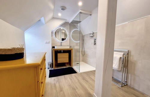 Nathalie will welcome you to your gîte in Vains (an old village of fishermen and willow growers), between Granville and Mont Saint Michel. You'll be staying at the entrance to the salt meadows in a modern, comfortable gîte with a beautiful living room on the first floor (fitted kitchen, sitting room with sofa bed, TV, etc.) and upstairs two adjoining double bedrooms and bathroom (Italian shower). When you return from your walk, you can relax in one of the garden lounges, then dine around the barbecue on your terrace. Arnaud, "Détours De Normandie" tourist guide, will be happy to show you around our beautiful region, according to your wishes and his availability.
