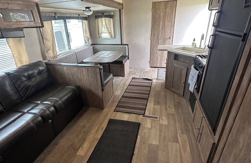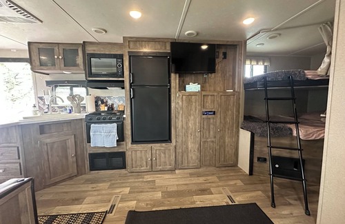 Camper has all the utility amenities you’ll need. Queen bed and bunk beds along with a couch that folds out and a table that converts into a bed for one adult or two small children.